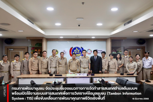 นายสยาม ศิริมงคล อธิบดีกรมการพัฒนาชุมชน มอบหมายให้ นายสามารถ สุวรรณมณี รองอธิบดีกรมการพัฒนาชุมชน เป็นประธานการประชุมชี้แจงแนวทางการจัดทำสารสนเทศตำบลต้นแบบเพื่อพัฒนาคุณภาพชีวิต ประจำปีงบประมาณ พ.ศ. 2569 ควบคู่กับการเปิดใช้งาน ระบบสารสนเทศเพื่อการวิเคราะห์ข้อมูลชุมชน (Tambon Information System : TIS) เพื่อเสริมสร้างศักยภาพบุคลากรในการใช้ข้อมูลเป็นฐานในการวางแผนพัฒนาพื้นที่อย่างมีประสิทธิภาพ ผ่านระบบการประชุมวีดิทัศน์ทางไกล (Video Conference) และระบบทีวี พช.