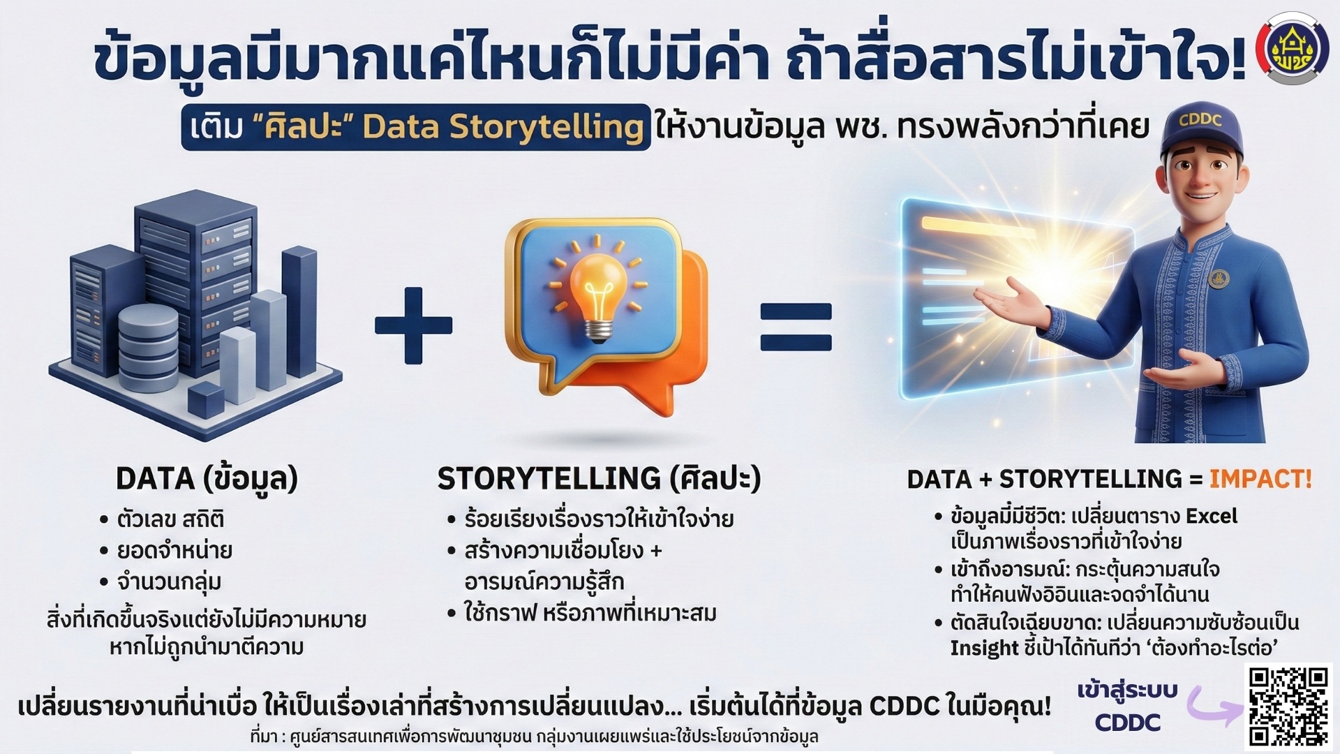 ศูนย์สารสนเทศเพื่อการพัฒนาชุมชน ขอเชิญชวนทุกท่านมาร่วมกันเติม "ศิลปะ (Storytelling)" เข้าไปในงานข้อมูล เพื่อยกระดับการนำเสนอให้ทรงพลังกว่าที่เคย!