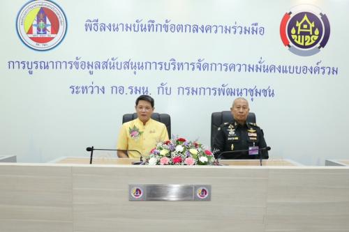 พิธีลงนามบันทึกข้อตกลงความร่วมมือว่าด้วยการบูรณาการข้อมูลสนับสนุนการบริหารจัดการความมั่นคง แบบองค์รวม เป็นการบันทึกข้อตกลง ระหว่าง กรมการพัฒนาชุมชน กับกองอำนวยการรักษาความมั่นคงภายในราชอาณาจักร ภายในพิธี ประกอบด้วย การชมนิทรรศการและวีดิทัศน์เกี่ยวกับภารกิจการบูรณาการข้อมูลด้านความมั่นคง และปิดท้ายด้วยการลงนาม ระหว่างประธานในพิธีทั้งสองฝ่าย